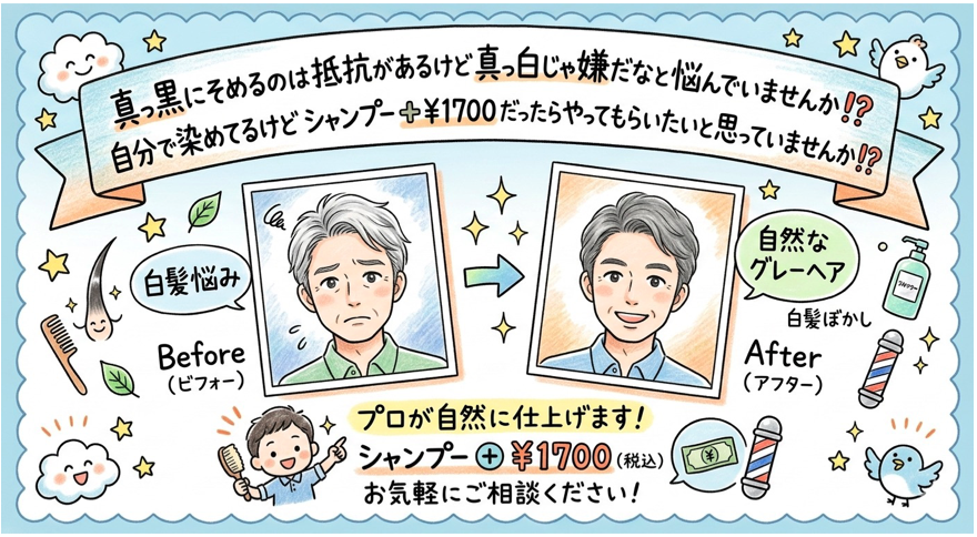まずはカットのついでに、**「ブログを見た。白髪の相談に乗ってくれ」**と一言お声がけください。